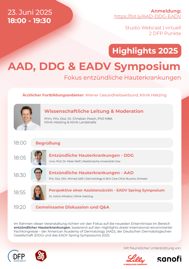 Die Veranstaltung wird als Livestream aus unserem TV-Studio in Wien übertragen und ist mit 2 DFP Punkten für das Fach Dermatologie approbiert.