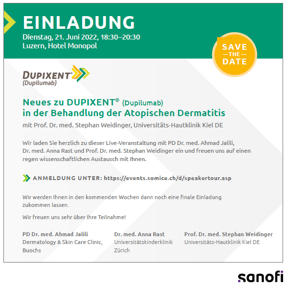 Veranstaltungen 09.05.2022 EINLADUNG - 21. Juni 2022 - Neues zu DUPIXENT® (Dupilumab) in der Behandlung der Atopischen Dermatitis Hier können Sie sich anmelden!