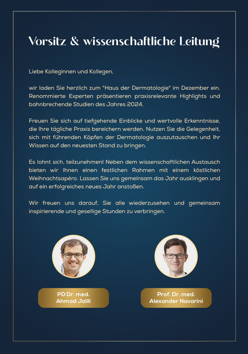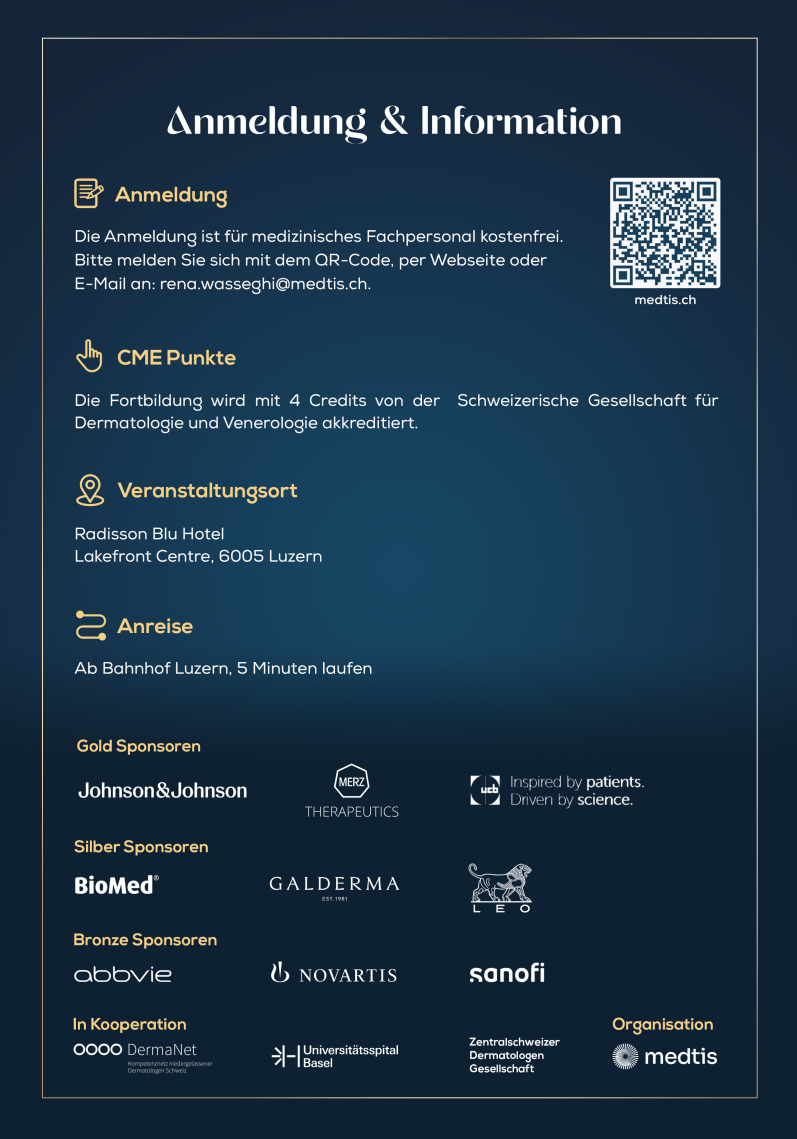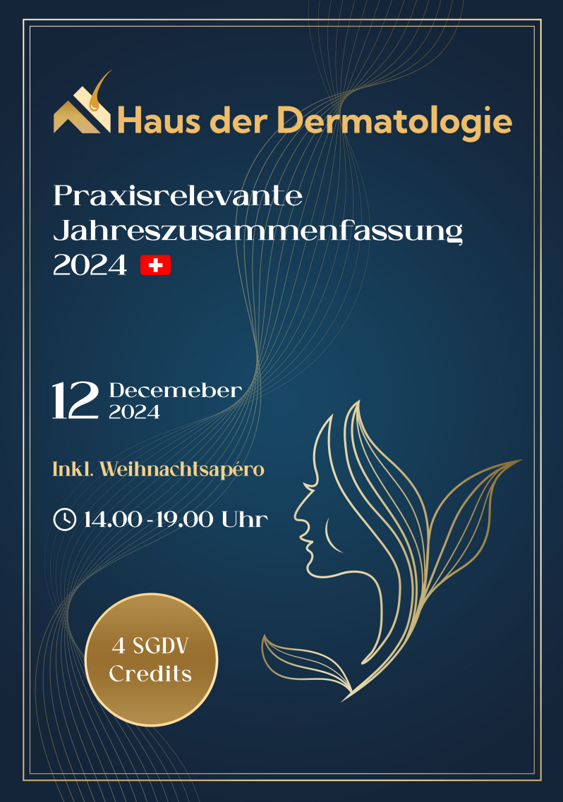 Veranstaltungen 28.08.2024 HAUS DER DERMATOLOGIE - Praxisrelevante Jahreszusammenfassung 2024 - 12. Dezember 2024 - Radisson Blu Hotel, Luzern Hier können Sie sich gleich per Mail anmelden!