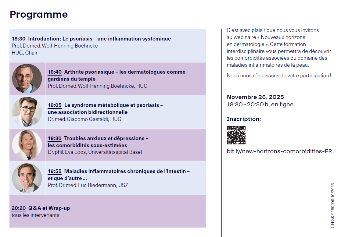 Veranstaltungen 17.11.2025 Invitation Live Webinar (francais / anglais) - "Nouveaux horizons en dermatologie" - 26. November 2025 Vous pouvez vous inscrire ici.