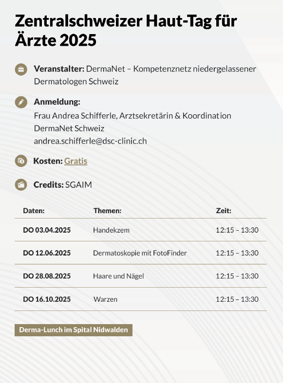 Veranstaltungen 07.02.2025 ZENTRALSCHWEIZER HAUT-TAG | Derma-lunch für Ärzte im Spital Nidwalden Stans Anmeldung gleich hier per Mail möglich!