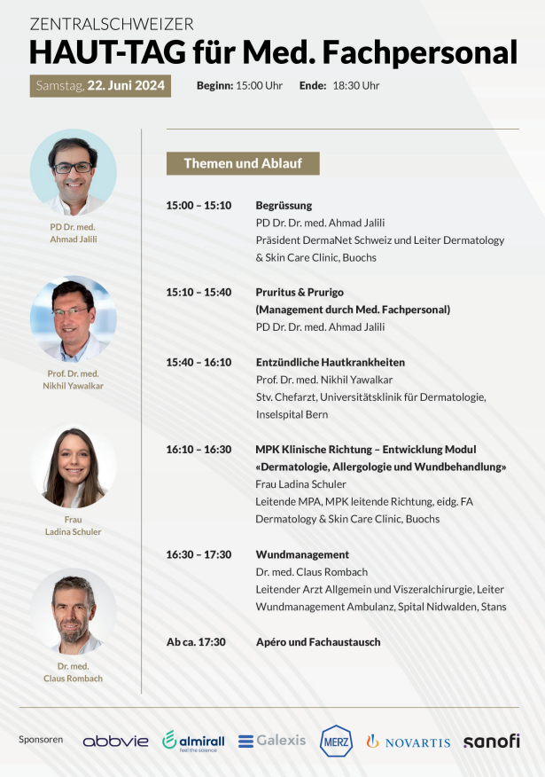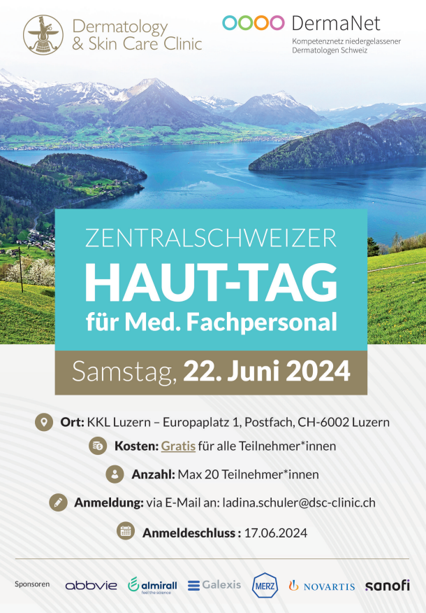 Veranstaltungen 09.04.2024 ZentralSchweizer Haut-Tag für med. Fachpersonal - 22. Juni 2024 - KKL Luzern Anmeldungen hier per Mail
